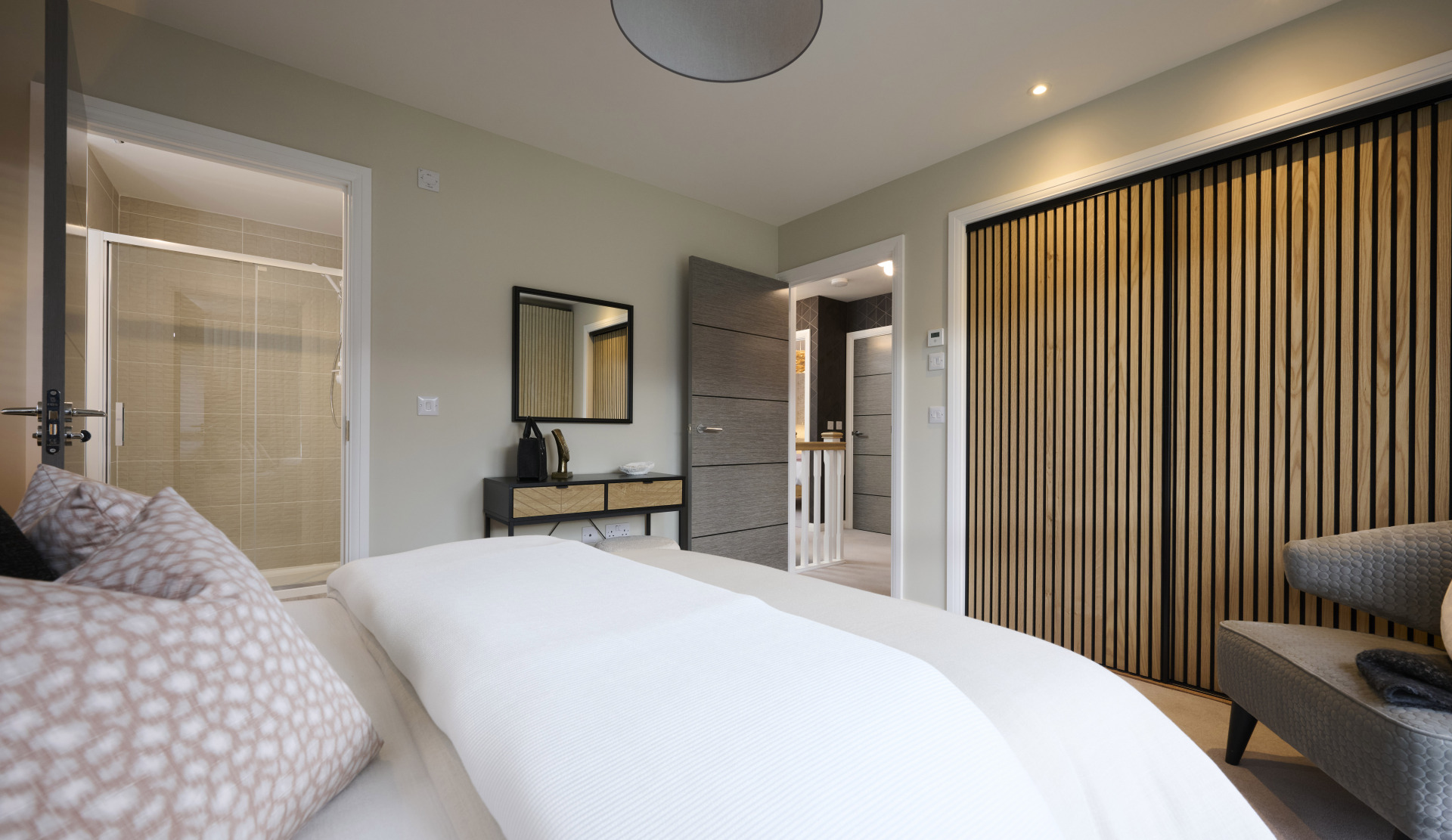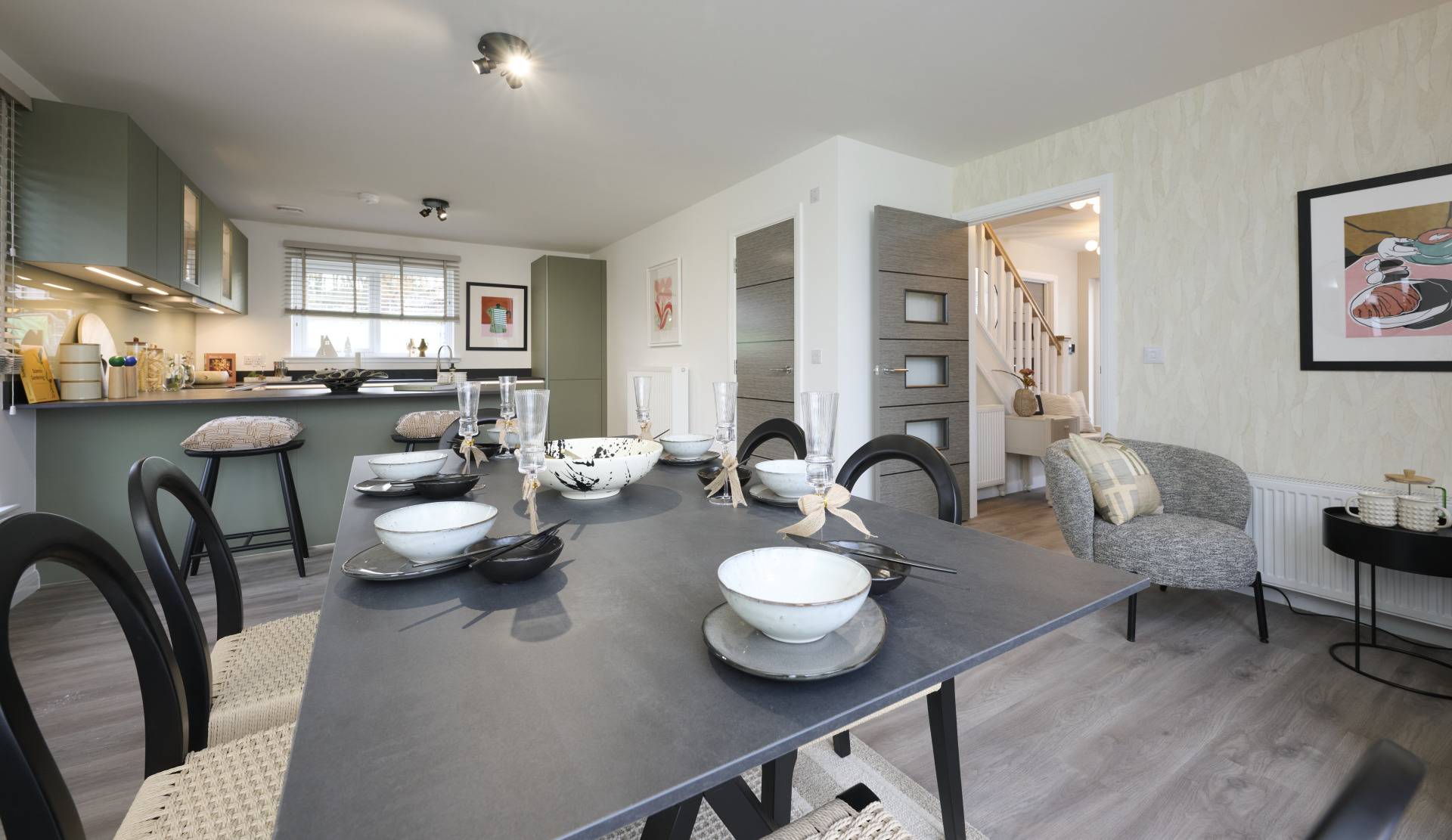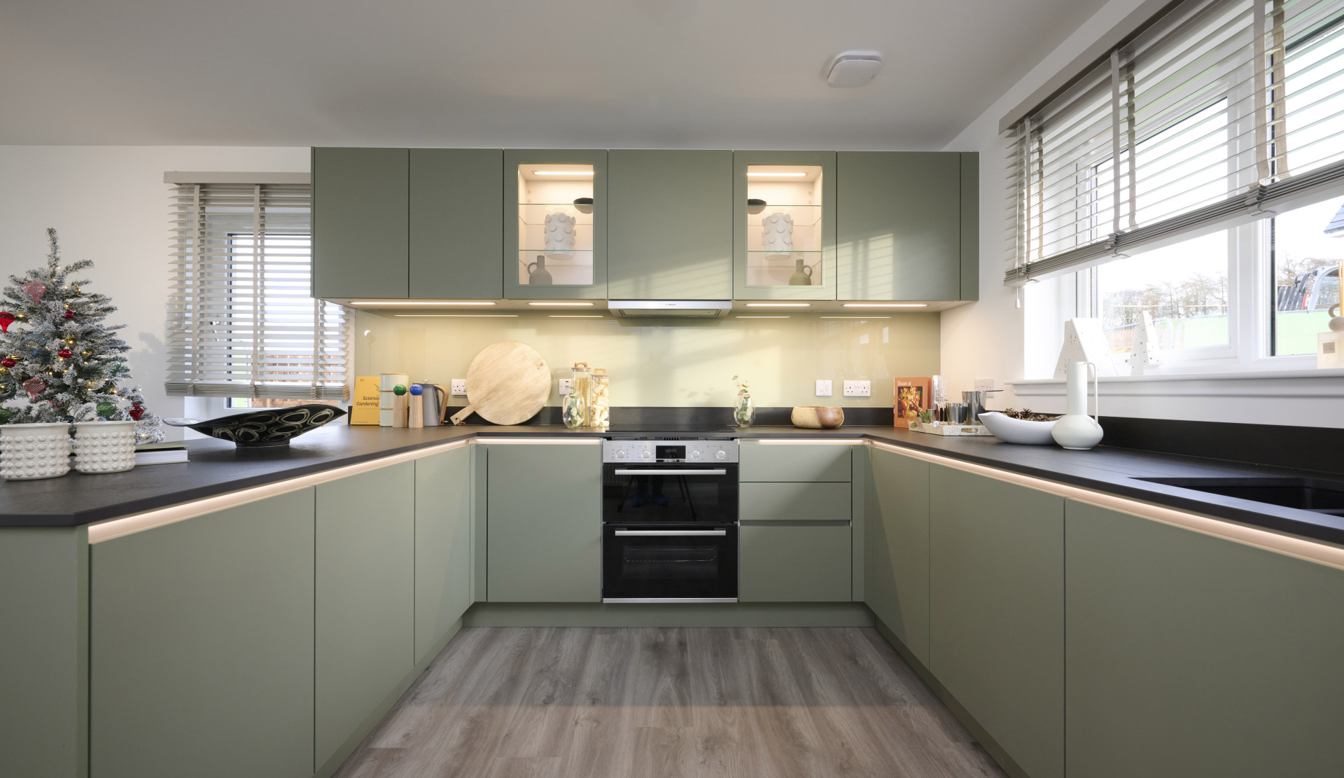 The interior design sees a warm neutral colour pallet throughout the show home. Natural woods, and rich browns paired with cool creams create a light and welcoming home that is easy to picture life in. The sage green kitchen, featuring cabinetry with windowed doors and a black worktop with soft under unit lighting adds to the modern feel of the home.
