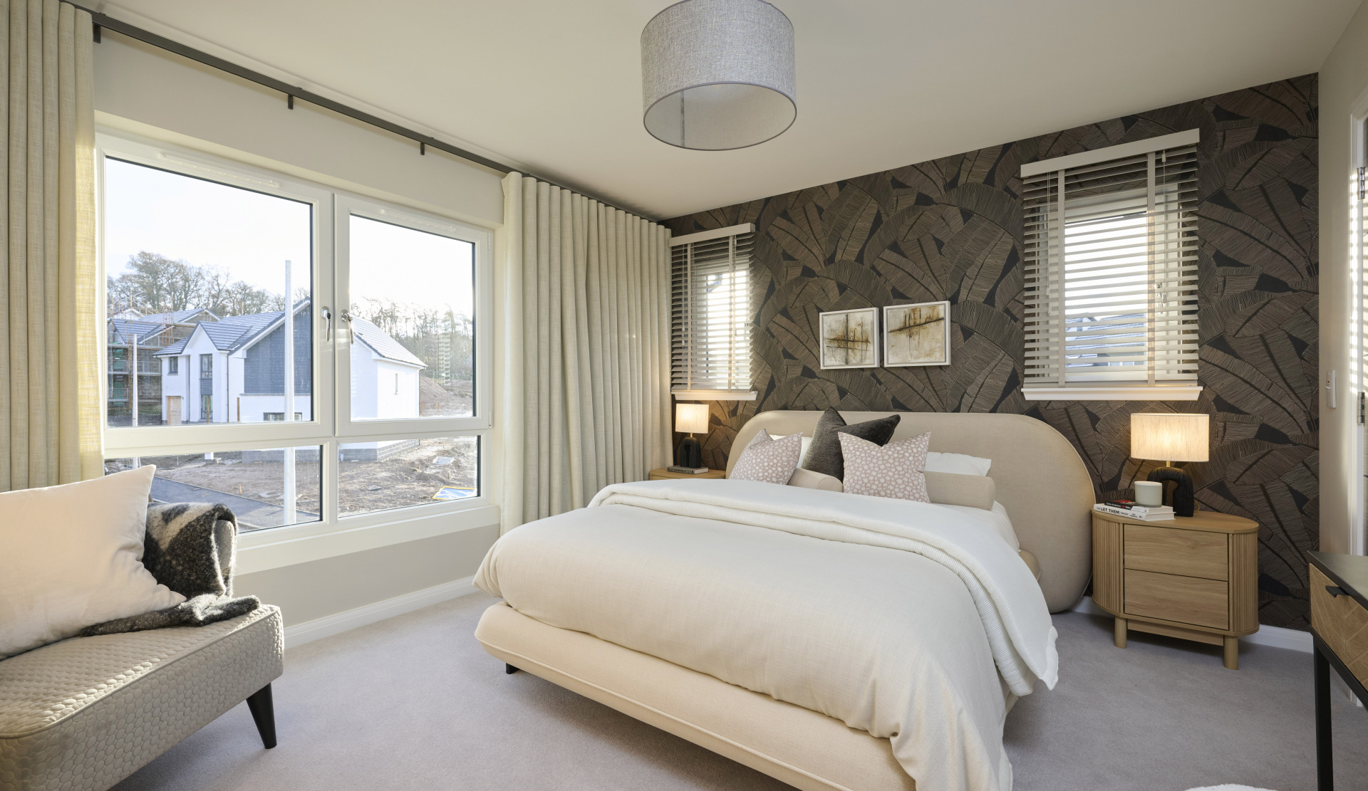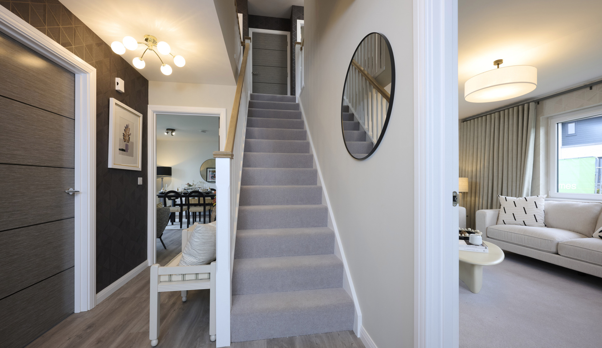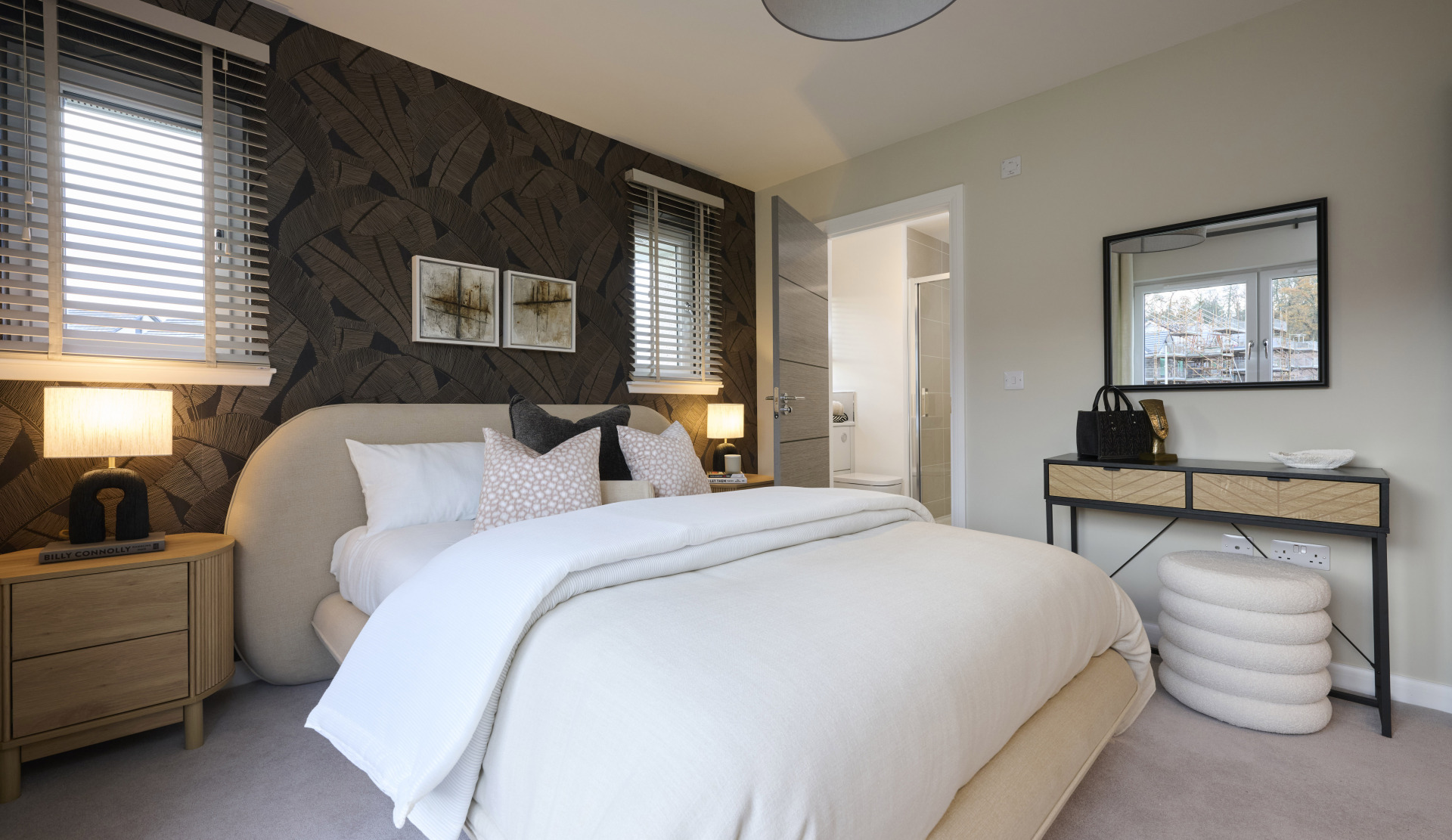 The interior design sees a warm neutral colour pallet throughout the show home. Natural woods, and rich browns paired with cool creams create a light and welcoming home that is easy to picture life in. The sage green kitchen, featuring cabinetry with windowed doors and a black worktop with soft under unit lighting adds to the modern feel of the home.